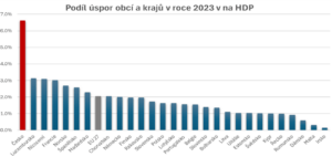 Mezi lety 2013 a 2023 se podíl úspor územní samosprávy na HDP v zemích Evropské unie zvýšil z 1,6 % na 2,1 %, tedy o pět desetin procentního bodu. V případě České republiky se tento podíl zvýšil z 3,7 % na 6,6 %, téměř o tři procentní body. Úspory obcí se na objemu úspor územní samosprávy v České republice podílely 83 %, takže tvořily naprostou většinu. Byly to tedy obce, jejichž úspory rostly v poslední době rychleji než průměr za země EU a které se v rámci 27 zemí zasloužily o prvenství České republiky.