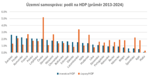 Graf 2: Podíl investic a úspor územní samosprávy na HDP (průměr 2013–2024) (zdroj: Prezentace J. Pavla (NRR) na konferenci Sdružení místních samospráv v říjnu 2025)